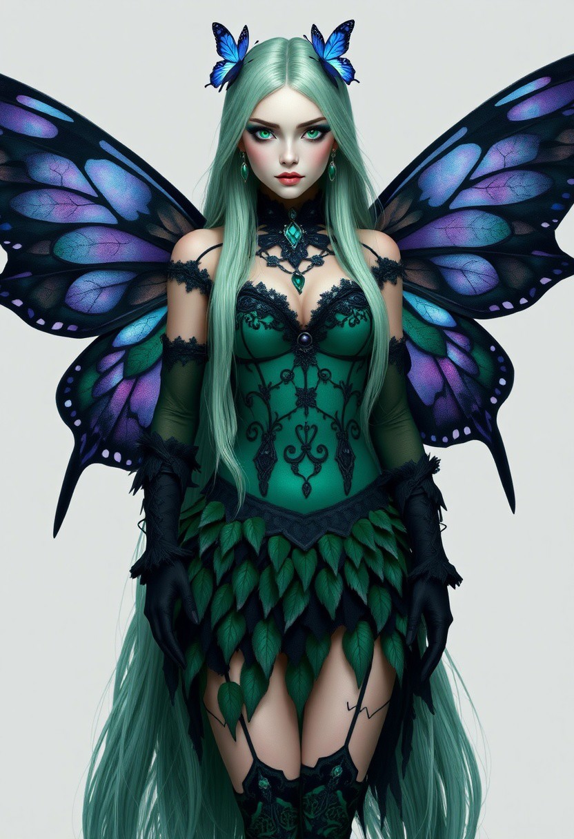 Fantasy fairy woman with long, flowing mint-green hair cascading past waist. Large, bright green eyes. Pale, luminous skin. Two pairs of large, translucent butterfly wings with intricate blue and pink vein patterns. Ornate outfit combining dark and emerald green: High-necked black lace collar adorned with small blue butterflies Fitted bodice in emerald green with a sweetheart neckline, overlaid with sheer black fabric Sleeves made of layered black feathers from shoulder to elbow Long black gloves extending past elbows, decorated with emerald green leaf patterns Lower body attire: High-cut emerald green leotard base Asymmetrical overskirt: shorter on right, longer on left, made of layered black and emerald green fabric with tattered, feather-like edges Thigh-high black boots with pointed toes, adorned with emerald green leaf motifs Accessories: Two large, iridescent blue and purple butterflies perched in hair above ears Delicate silver jewelry with emerald accents around neck and wrists Overall aesthetic: Ethereal and slightly dark, blending natural elements with an otherworldly fairy appearance.