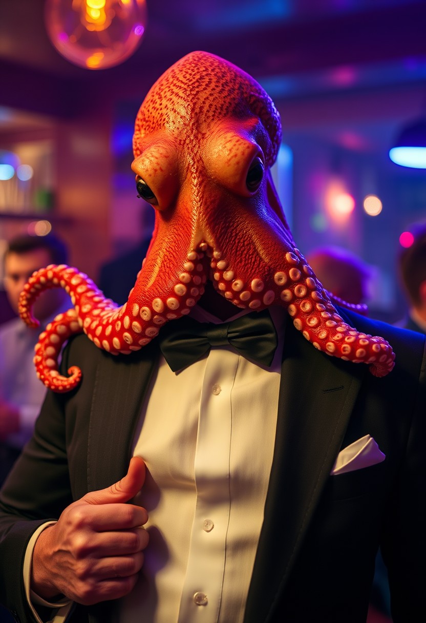 Cinematic. A dashing octopus. wearing a debonair suit, an enigmatic smile , a dynamic pose, one of class and sophistication. a gritty photograph, professional photography, in cocktail lounge. multicolored lighting. fantastic, exotic, adventurous. exciting,