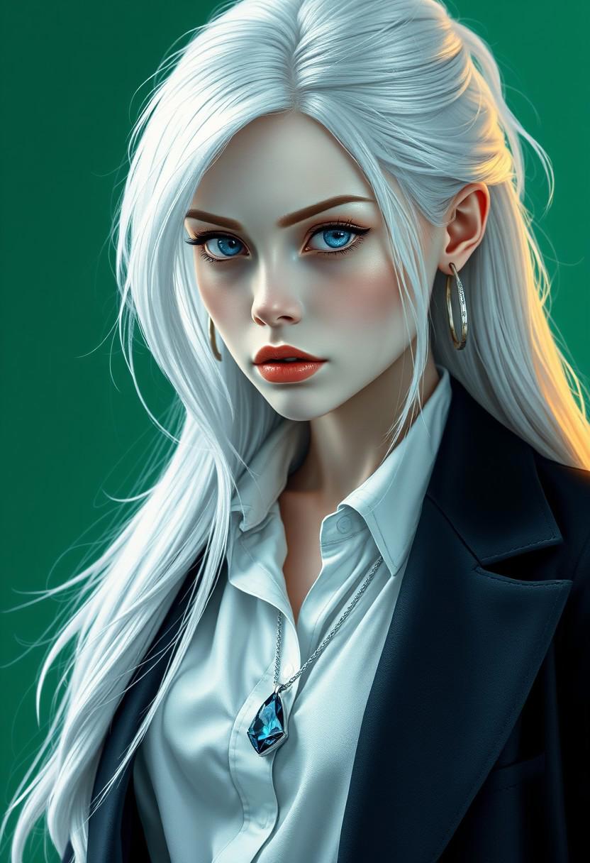 masterpiece, a painting made of precious stones, full body shot, score_9, score_8_up, score_7_up, (best quality:1.1),ultra-detailed, high resolution, super detailed , cinematic, hyperrealistic, Stylized digital portrait of a girl with snow-white skin and long, white hair, blue eyes. The subject is wearing a shirt, and a blazer. They have a aggressive expression with slightly parted lips and a aggressive posture. The background is a solid, vibrant emerald, which contrasts with the subject's attire. The person is accessorized with silver jewelry, including a necklace with a blue diamond pendant and small hoop earrings. full body, easynegative, flat color, dark theme,
