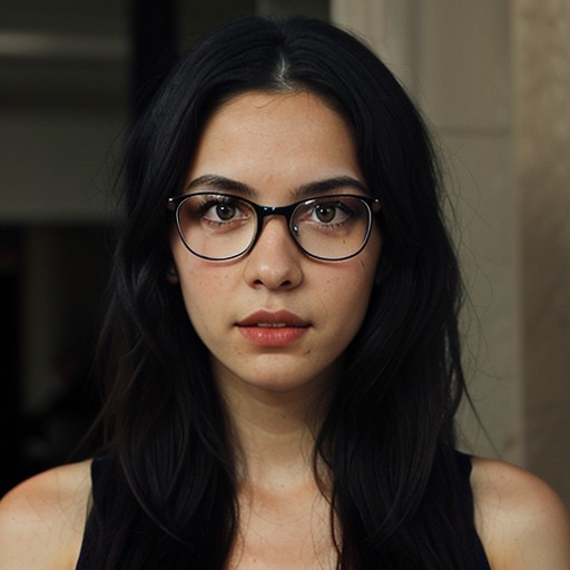 1girl, Greek, big beautiful dark green eyes with long eyelashes, long red dress, pretty face, long black hair, sensual lips, no makeup, glasses,