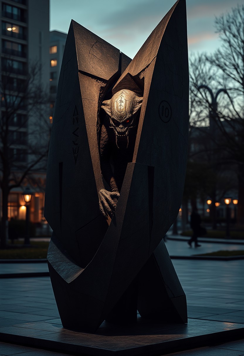 abstract sculpture, hidden monster, surreal urban setting, abstract form with sharp edges, mysterious shadow, monster blends into the sculpture, only recognizable in shadow, dynamic lighting, high contrast shadows, subtle movement, surreal proportions, dark and eerie atmosphere, detailed textures, intricate stone and metal design, urban park at dusk, glowing eyes peeking through the sculpture, shifting form as you pass by, haunting presence, humanoid monster, stone-like appearance, cryptic symbols etched into the surface, blending seamlessly with the environment, fantasy realism, eerie glow, hidden details, enigmatic design
