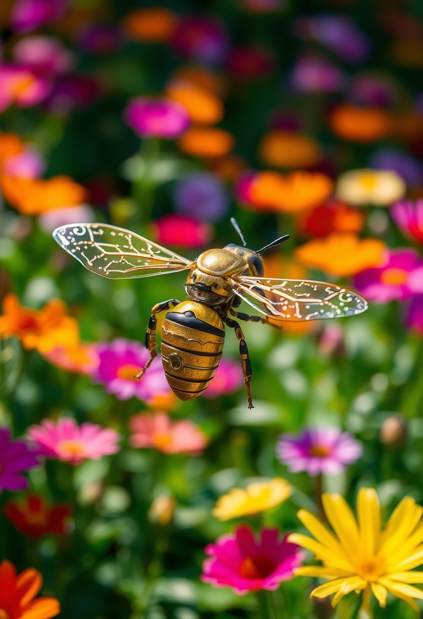 Imagine a close-up of a robotic bee hovering in mid-air, its delicate metal wings shimmering in the sunlight. Surrounding it is a vibrant garden filled with colorful flowers, each petal telling a story of life and beauty. The bee seems to dance gracefully, merging engineering precision with the elegance of nature. In this intersection of technology and the environment, we sense the human desire to harmonize innovation with the natural world.”