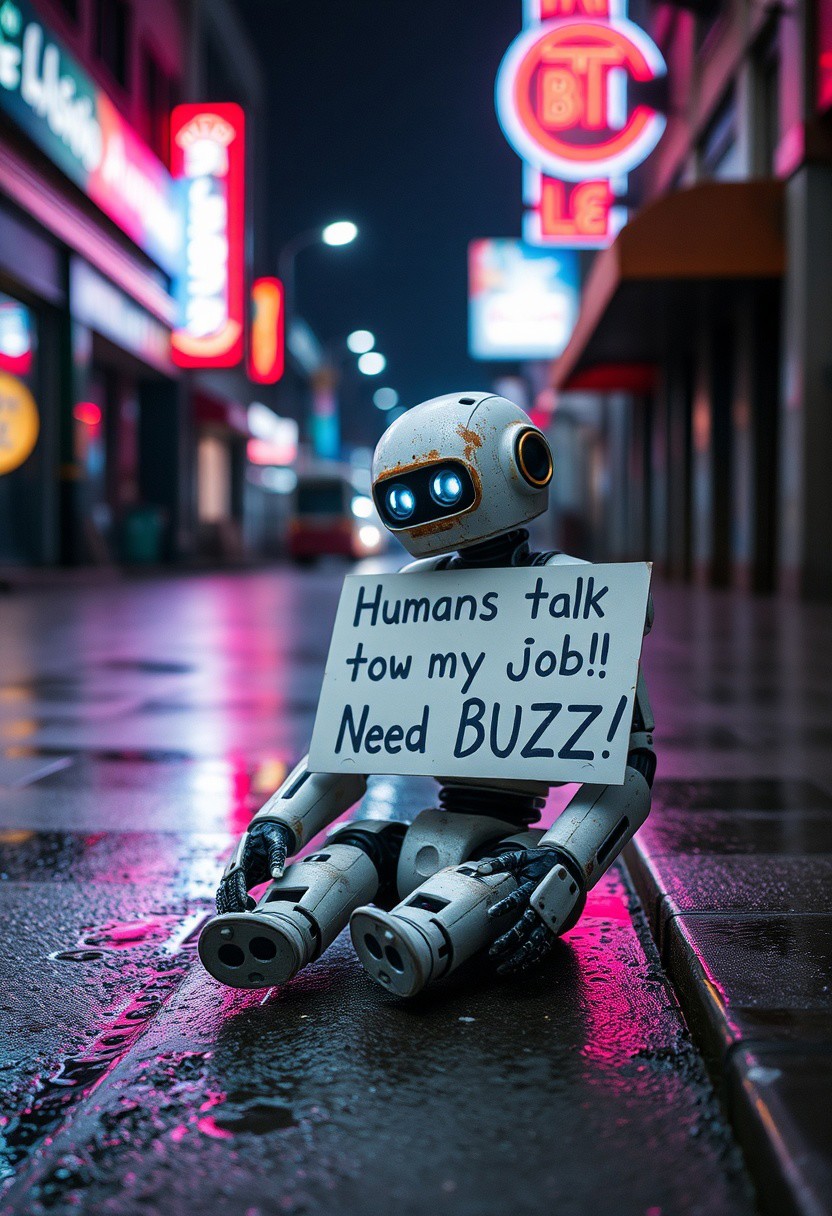 Sad robot sitting on street with sign "Humans took my job! Need BUZZ!". Wet street, night, neon lights, raining, worn look, rusty.