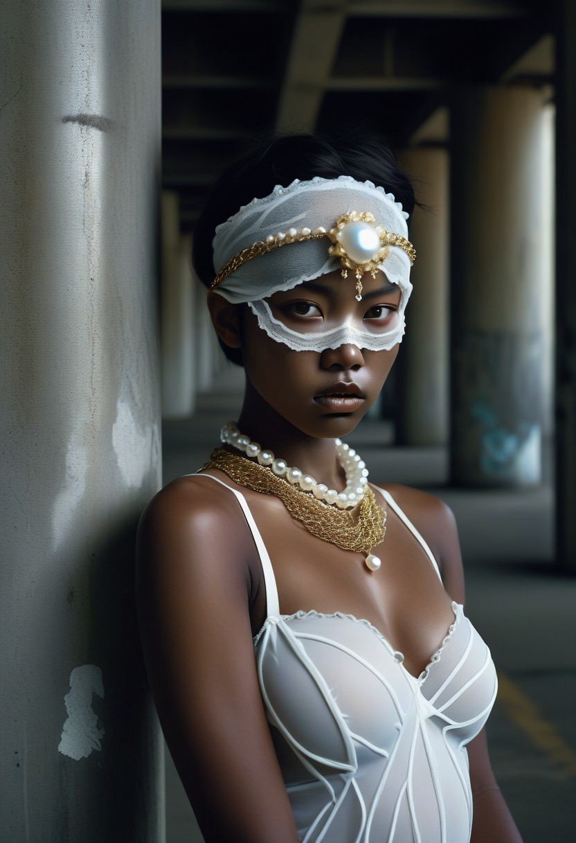 The image is a high-resolution photograph featuring a young Asian woman with a striking, avant-garde aesthetic. She is posed leaning against a rough, textured concrete pillar in a dimly lit, industrial setting, possibly an abandoned or underutilized parking garage. The woman has short, dark hair styled in a messy bob, adorned with a delicate, lace-trimmed white headband. The image is a high-resolution photograph of a woman with a striking, avant-garde aesthetic. She is a person of color with a medium-dark skin tone, likely of African or mixed ethnicity. She has a strong, athletic build with a prominent bust, suggesting she may be of African descent. Her eyes are obscured by a intricate, ornate headpiece that covers her face, adorned with gold chains, pearls, and a central, large, white pearl. The image is a high-resolution photograph featuring a striking, surreal portrait of a person with an otherworldly aesthetic. The subject is a person with dark skin, dressed in an outfit that appears to be made of iridescent, glowing material. The fabric has a texture reminiscent of a jellyfish or sea creature, with large, translucent, flower-like structures that emit a soft, ethereal light.