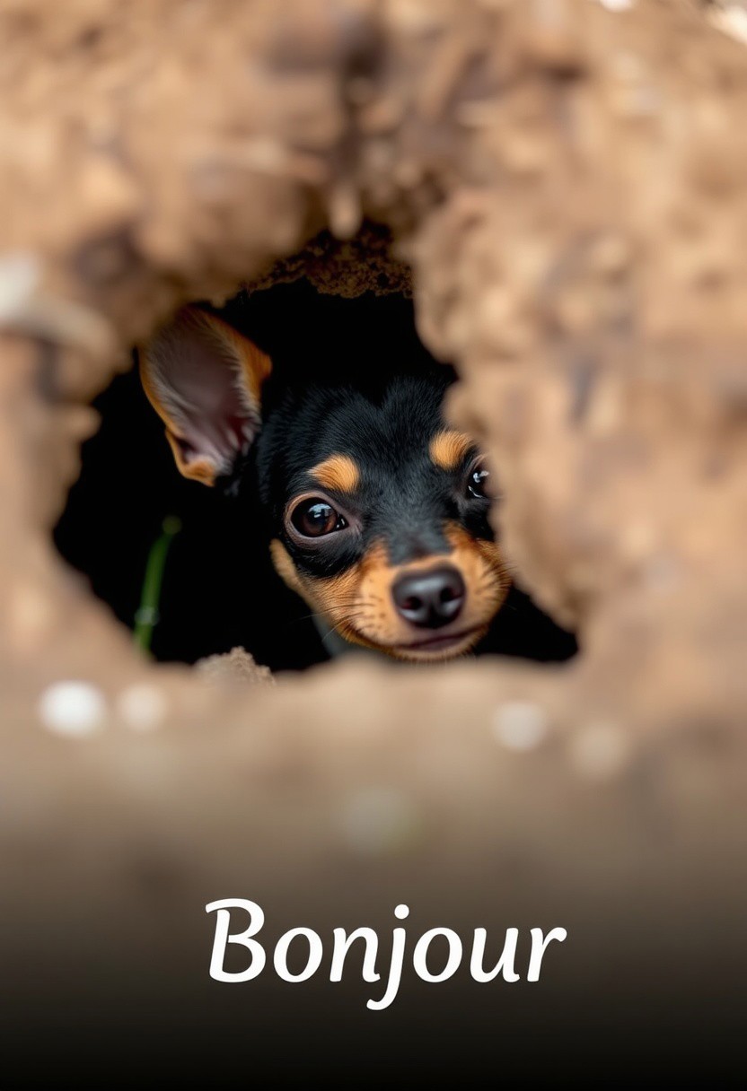 Miniature Pinscher in a burrow, Shy Miniature Pinscher. The miniature Pinscher is barely visible, only his head are partially out of the burrow, Text:"Bonjour"