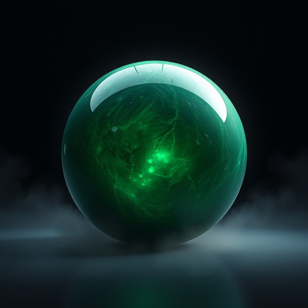 Huge jade orb with black glowing aura. Simple background, dark background, cinematic view, no more text
