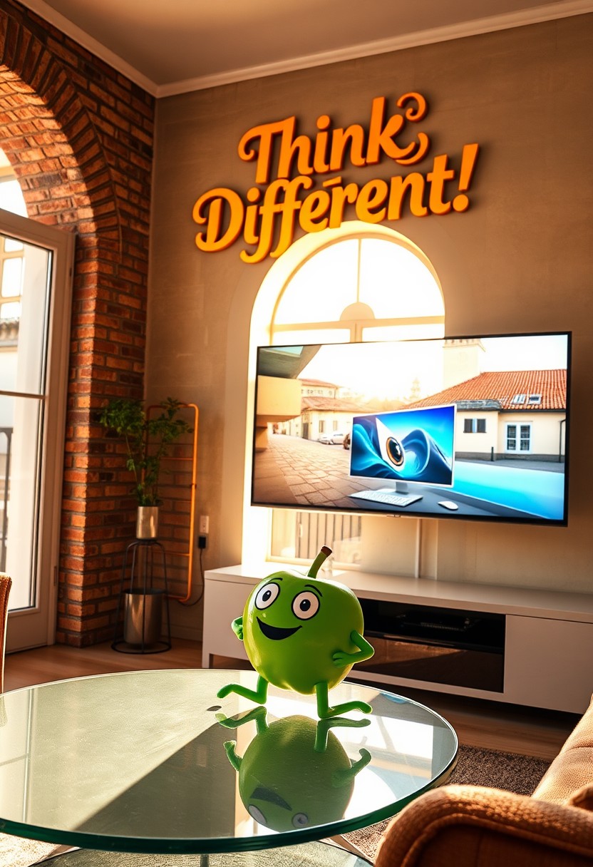 "In a stylish Italian apartment, a cartoonish green apple with playful eyes, simple arms, and legs sits on a sleek glass coffee table, watching a cutting-edge OLED TV mounted on the wall. The TV showcases a vibrant Apple computer commercial in stunning 4K, with futuristic product designs flashing across the screen. Sunlight pours in through a large arched window, casting a warm, golden glow over the room, with a view of a charming piazza and terracotta rooftops. The green apple, with exaggerated, expressive eyes and a big smile, leans forward eagerly, its limbs wobbly and exaggerated like a fun cartoon character. Above the TV, a colorful, intricately designed cardboard sign reads 'Think Different!' in a quirky, Renaissance-meets-modern font. The sign is laser-cut, backlit by soft LED lights, giving it a glow that adds to the room's mix of history and technology. The apartment blends classic Italian architecture with sleek tech. Exposed brick walls meet high-tech digital art frames that display rotating artwork. Smart lighting subtly shifts to match the atmosphere, while the soft hum of a voice-activated espresso machine fills the air with the scent of coffee. The green apple's glossy, cartoon-like body fits perfectly in this fusion of traditional Italian elegance and playful, futuristic style."