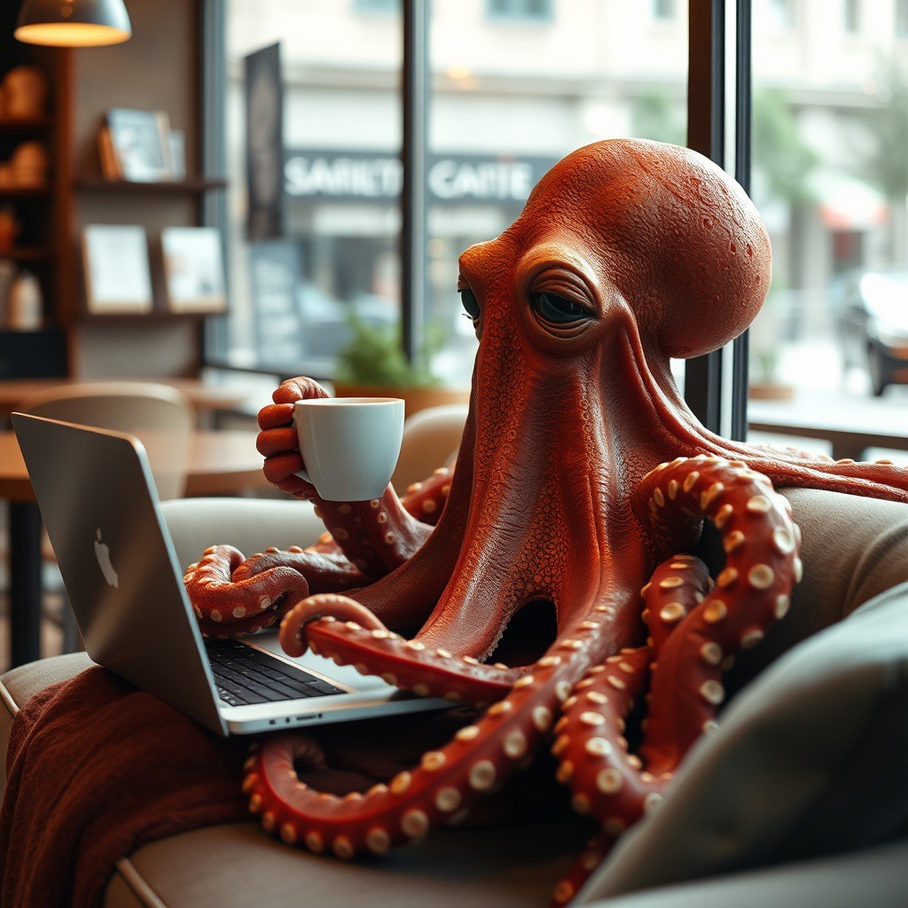 a very detailed close picture of an octopus siting on a sofa ina coffe store and working on a macbook while drinking a cofee