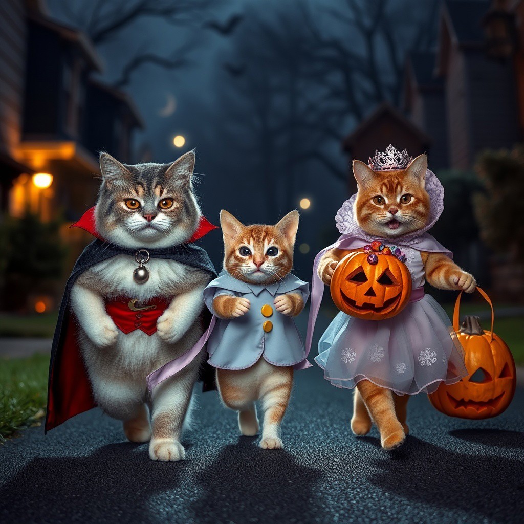 Ultra realistic. white grey brown happy cat with a vampire costume, a small hamster with hero costume, a orange cat on a princess costume carring a carved pumpkin with candies, walking on a suburban street, trick or treating houses, midnight light, shadows of real monsters behind them