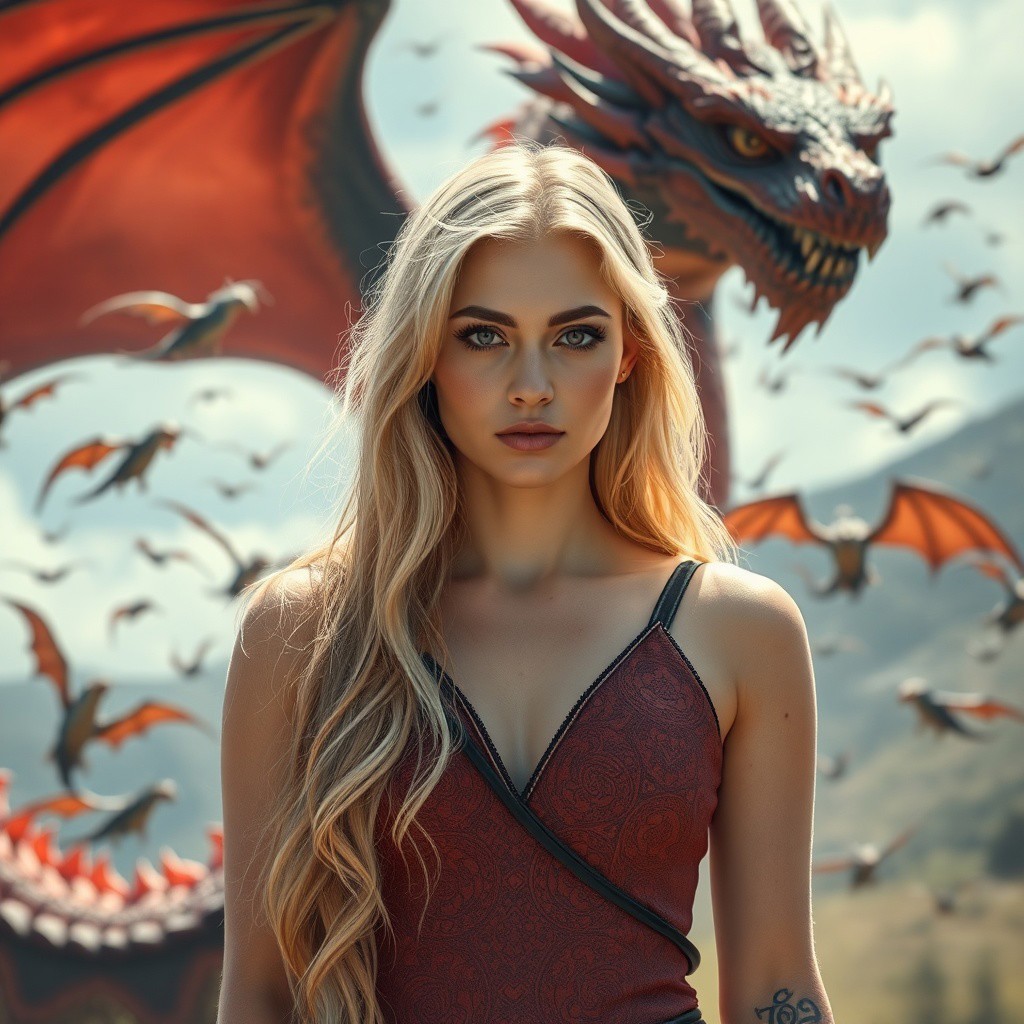 a beautifull woman is satanding in front of a dragon , the dragon is red and blue, super focus on female, many baby dragons are flying in the backround, superrealistic, the woman has blond long hair, no makeup