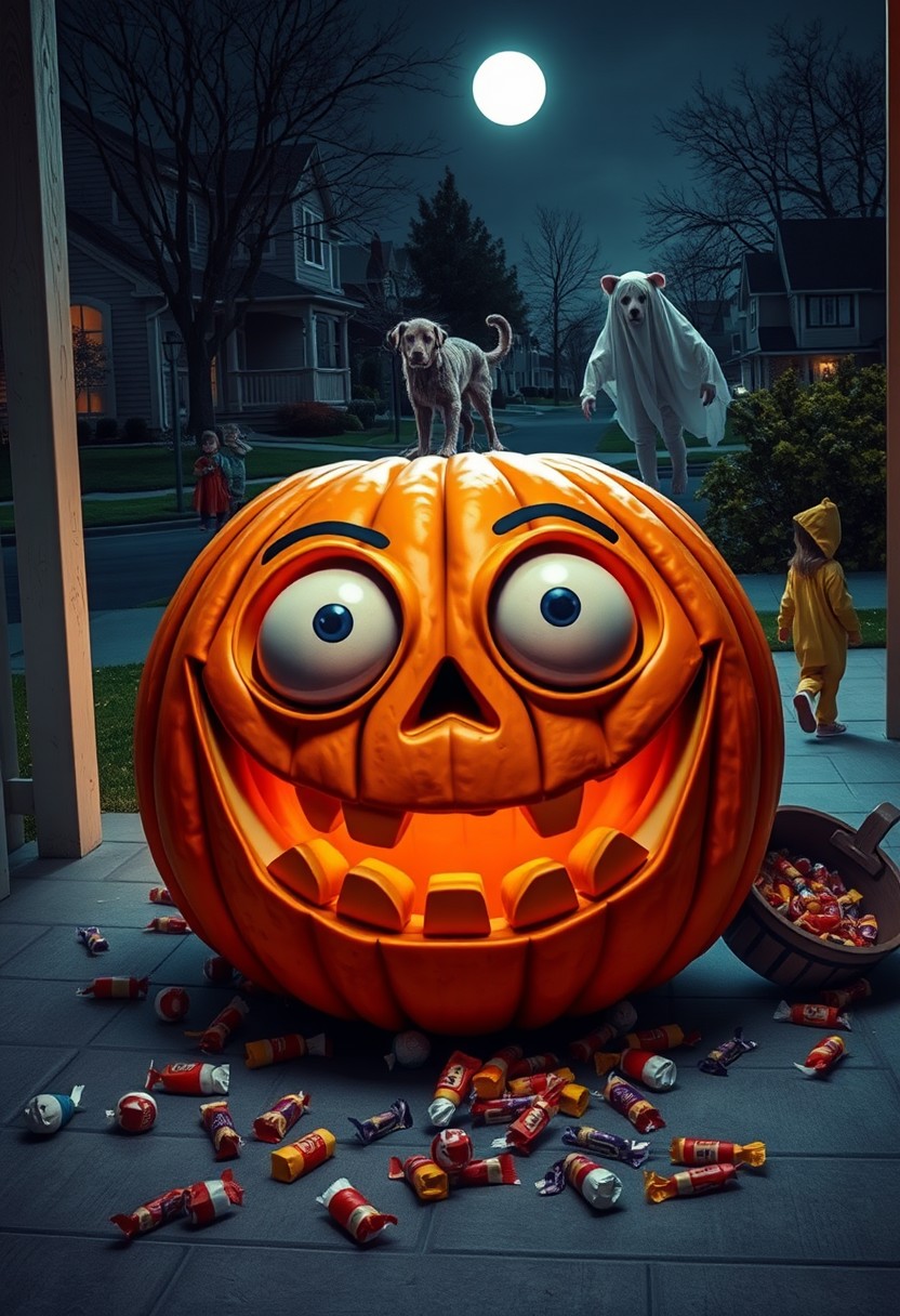 A large jack-o-lantern with an exaggerated, goofy grin and oversized, bulging eyes. The pumpkin is sitting on a porch surrounded by scattered candy wrappers and a tipped-over bowl of candy. The background is a moonlit suburban street, with children in the distance dressed in comical costumes, like a dog dressed as a cat and a ghost with its sheet tangled up in a bush. The whole scene is playful and lighthearted, capturing the goofy chaos of Halloween night.