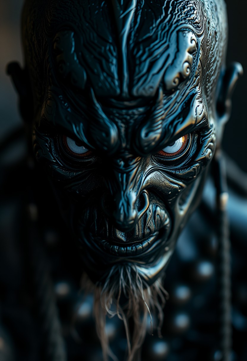 underworld warrior, small white eyeballs, hyper realistic, ultra detailed, translucent oiled skin, black skin