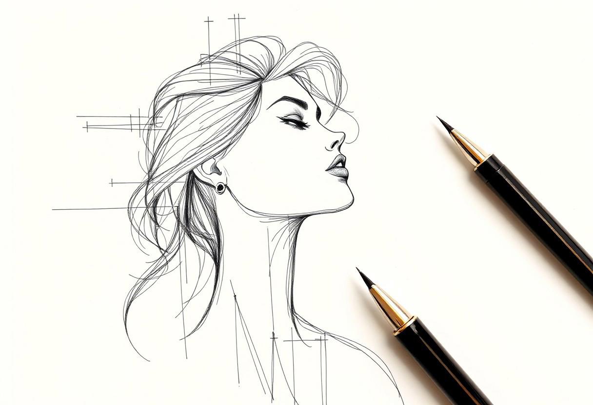 industrial_design_sketch_style,construction lines,A fountain pen sketching the shape of a beautiful woman on a piece of paper,