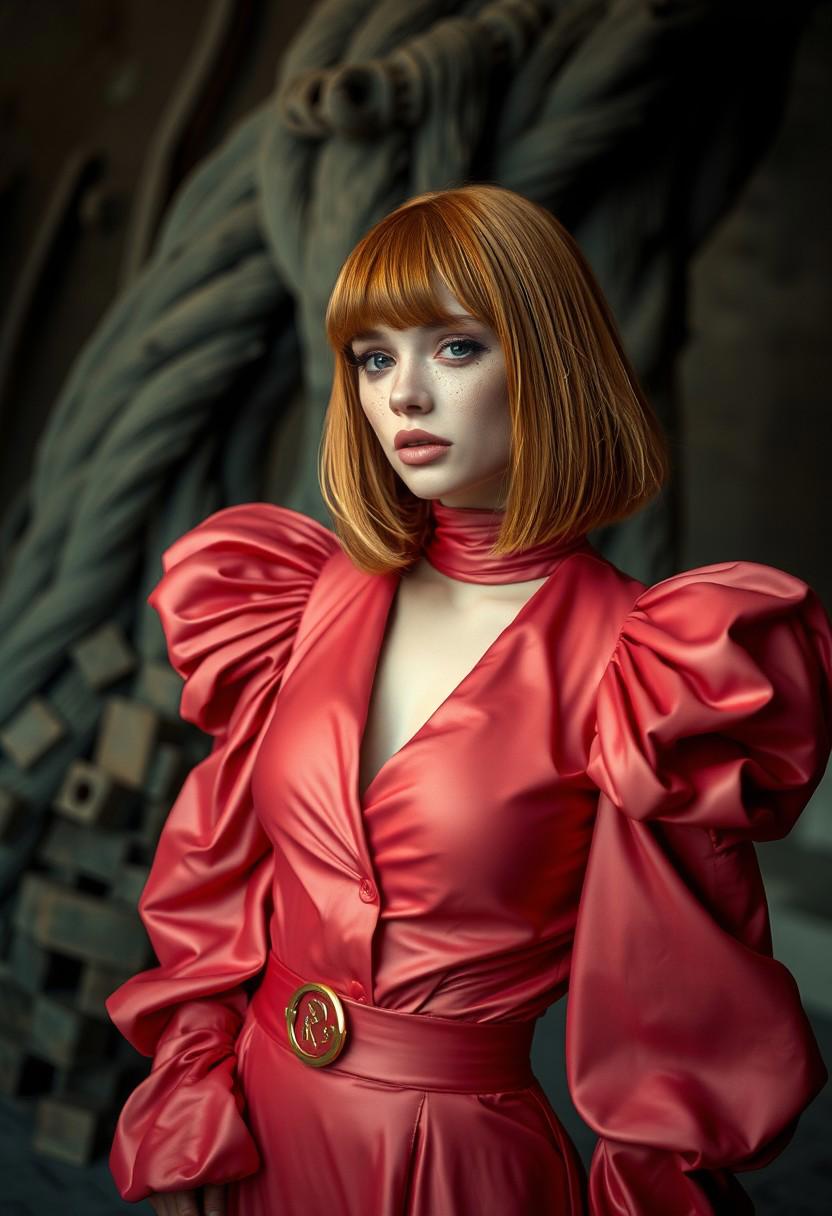 A striking abstract surreal fashion shoot featuring a beautiful ginger supermodel with a layered bob hairstyle in surreal clothes, surreal locations, surreal poses, beautiful make up