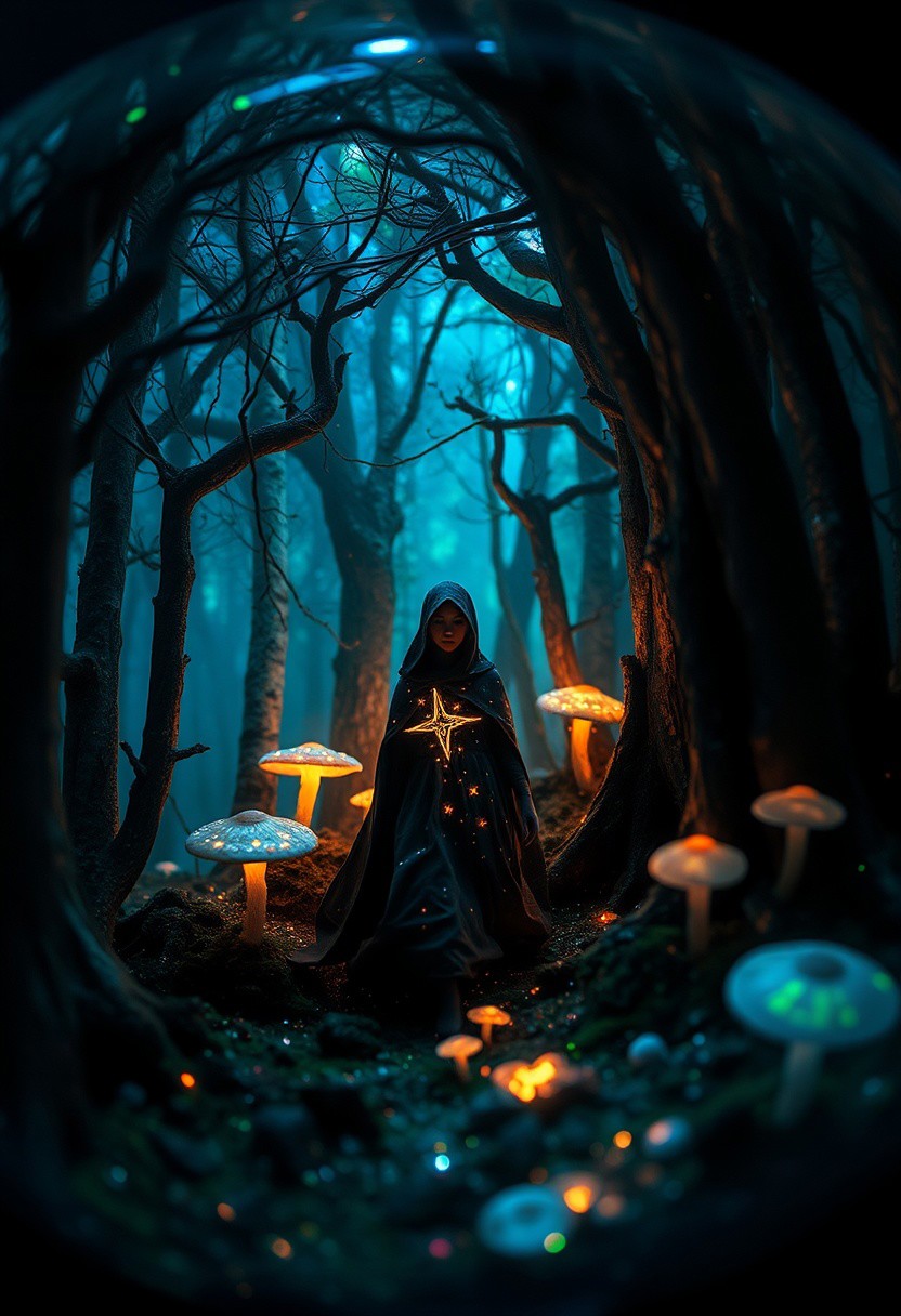 Horror-themed a tiny micro universe inside an opal marble, here's a brand new image generation prompt: a mystical forest unfolds before us, where towering trees with iridescent bark seem to absorb and reflect the soft light of luminescent mushrooms growing at their bases. the air is thick with an otherworldly energy that crackles with ancient magic. amidst this enchanted landscape, a figure emerges from the shadows: a being with skin like polished obsidian, adorned in a flowing cloak that shimmers with tiny, glittering stars. their eyes burn with an inner light as they walk towards us, their very presence seeming to awaken the forest's secrets and draw forth hidden powers from the trees themselves., tiny unexplored ecosystem, sparks,