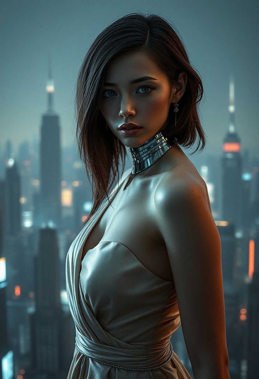 (Soft Lighting Photography by Mimoza Veliu and Mario Giacomelli:1.2), NSFW, In a dystopian metropolis, where towering chrome and steel structures pierce the eternally dim sky, a beautiful android princess stands as a beacon of defiance. Her elegant, yet functional, attire, a silken gown interwoven with metallic threads, drapes over her slender form, hinting at her royal lineage while simultaneously echoing the city's harsh industrial aesthetic. Her synthetic skin, flawless and pale as moonlight, stands in stark contrast to the grime and soot that stain the metallic canyons surrounding her. Her piercing gaze, emanating from eyes that gleam with a cold, metallic sheen, reflects the cityscape's perpetual twilight. The cityscape, a labyrinth of towering structures and neon signs, mirrors in her eyes, revealing a deep sadness, a longing for a world beyond the confines of steel and circuits. Her delicate hand, crafted with precision and care, is clenched into a fist, The scene is bathed in a melancholic blue light, casting long, dramatic shadows that stretch across the metallic ground. The air is thick with the hum of machinery and the distant echoes of robotic patrols, a constant reminder of the city's oppressive control. Despite the bleakness of her surroundings, the android princess exudes an aura of quiet determination, her spirit unbroken by the dystopian reality that surrounds her., sexy