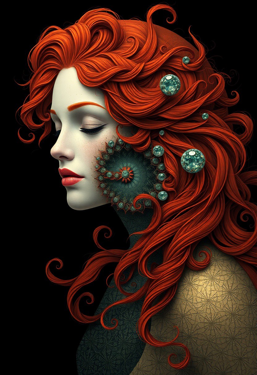 generate fractals swirling combining into a beautiful redhead woman. The word “Medusa” is formed out of fractals