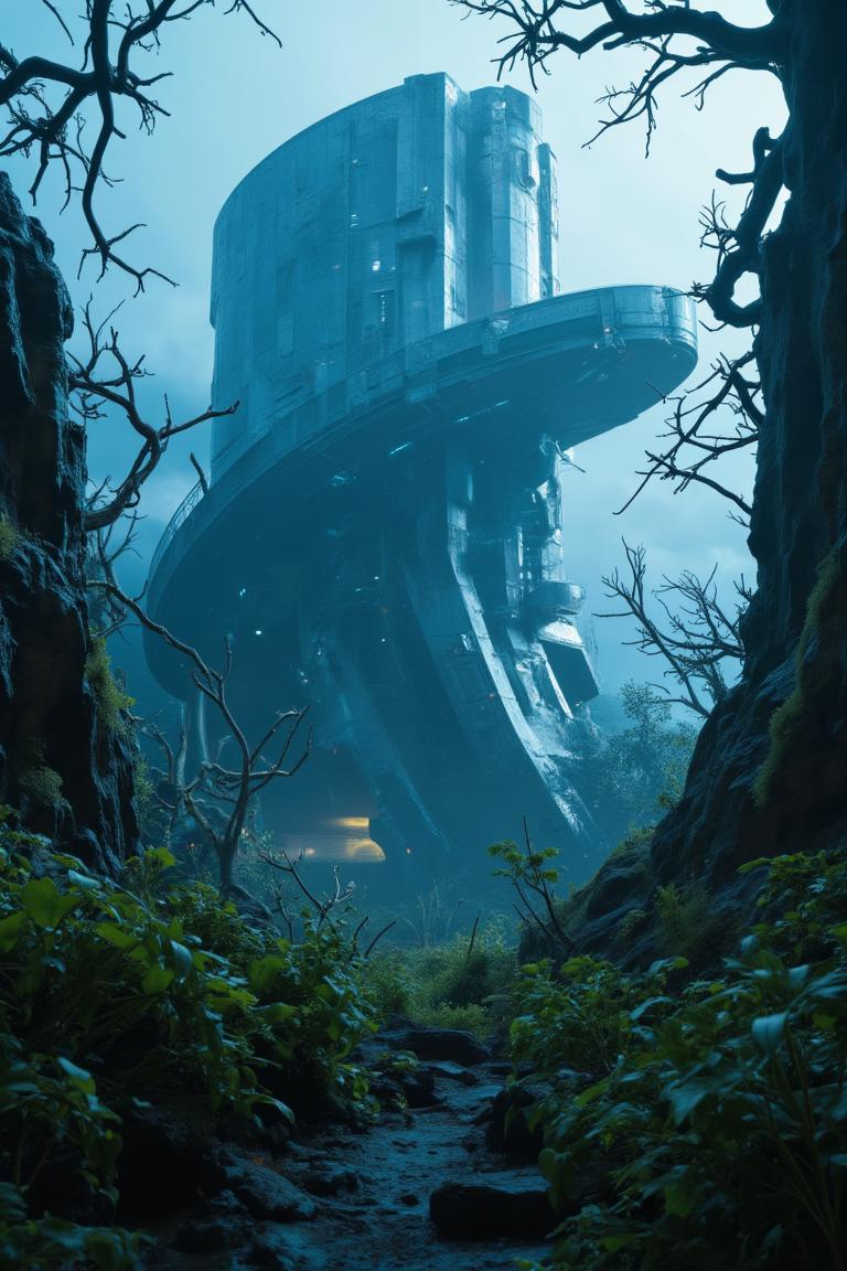Cinematic photograph, surrealistic nuclear power plant with futuristic architecture, featuring a massive, imposing structure that defies gravity, twisting and turning in impossible ways, with sharp, angular lines, a cold, metallic exterior shimmering and glowing with a soft, ethereal blue light, surrounded by a dense, misty forest with twisted, gnarled trees, cinematic lighting with a cold, blue-green color palette casting long, ominous shadows, taken with a Nikon D850, wide-angle lens, low-angle shot, 8K, UHD, highly detailed, grainy, high-quality, motion blur, hyper-detailed textures, hyper-realistic, with a palpable sense of foreboding and unease, emphasizing photorealism.