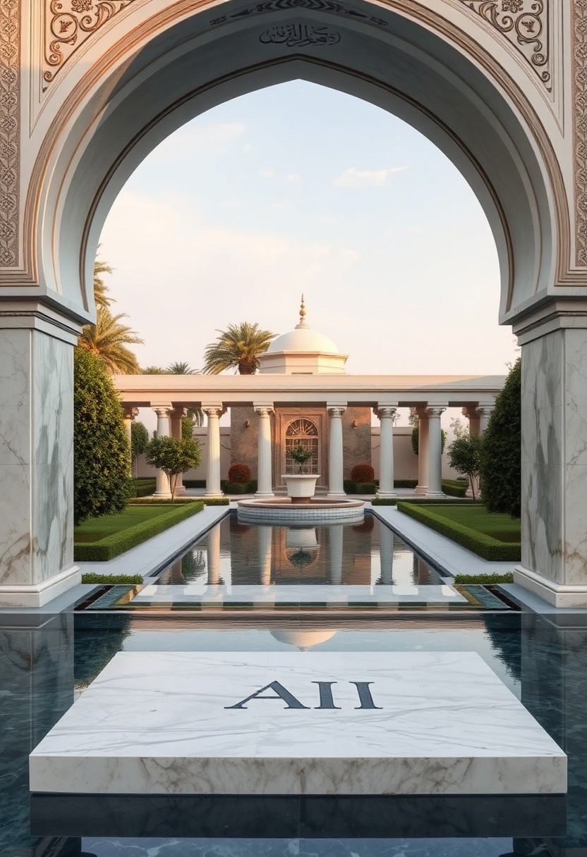 a marble plane arch with engraved Arabic calagraphy beyond the arch some incrementalist columns and a serene garden and a pool. rising from the water a marble plate with embossed the word 'AI'