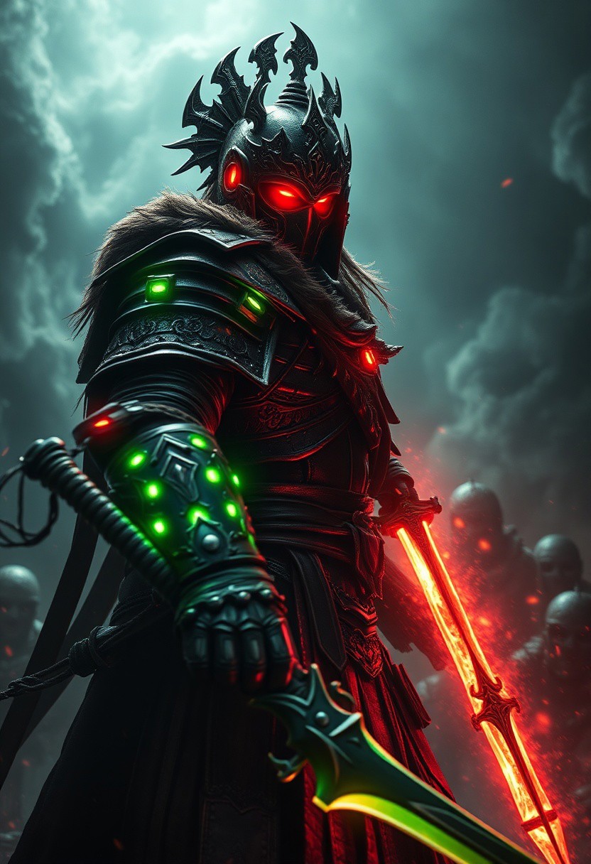 Epic dark fantasy vibrantly colored hyperdetailed ink art depicting a legendary warrior in defiance against impossible odds. Strong top lighting effect. Bioluminescent glowing armor and weapon accessories. Volumetric lighting. Chiaroscuro oil painting by Caravaggio. Deep glow effect, cinematic light bloom, cinematic lens flare. Grimdark, gritty, intense, volatile. Hypermaximalism. Motion blur. Full-frame fisheye lens. 32K cinematic hyperrealistic fantasy ultradetailed masterpiece.