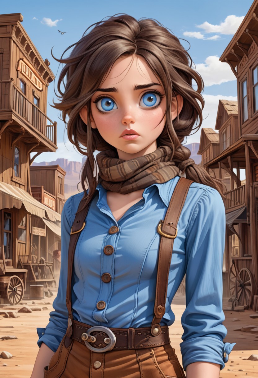 a young girl with large eyes and fair skin. She is dressed in a stylish, eild-west-inspired outfit, wearing a long-sleeved blue shirt with many buttons and brown suspenders. She has a scarf tied around her neck. Her hair is dark and slightly disheveled. The background of the image is a Wild West town at midday.