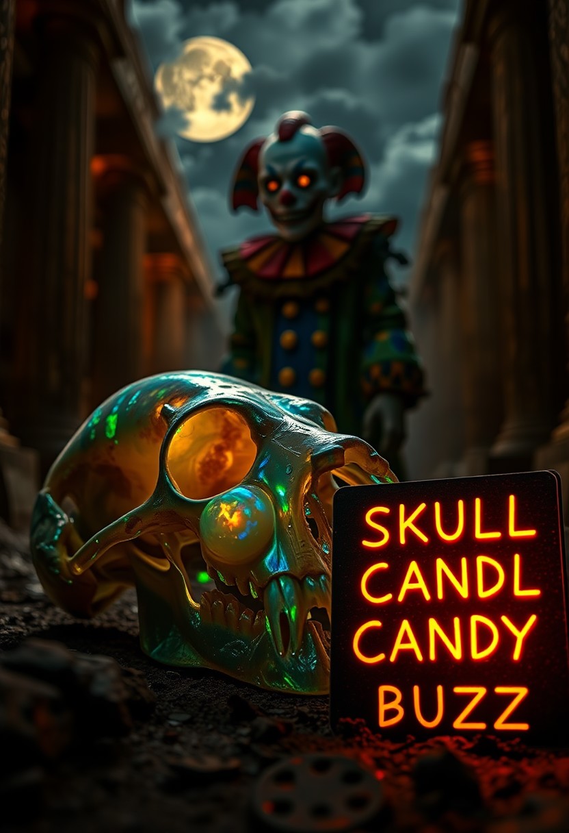 A close-up macro shot of a dog skull crafted from opal, resting within the ruins of an ancient Egyptian temple. The skull reflects a mystical iridescence with intricate details, while the setting exudes an eerie atmosphere. The scene is dimly lit by moonlight, partially obscured by thick clouds, casting shadows over the ruins. In the background, a terrifying clown stands clearly visible, dressed in tattered, colorful clothing with a menacing grin, pale face, and dark eyes glowing under the moonlight. Its unsettling presence dominates the scene. Nearby, a stylish, refined cardboard sign reads ‘Skull Candy Buzz’ in glowing orange fluorescent letters. The sign’s cool and fancy design contrasts sharply with the dark, creepy environment