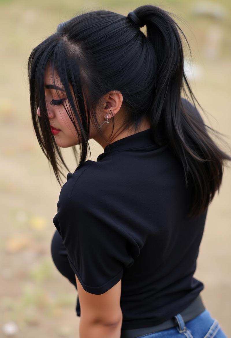 black hair, small breasts, bent over, outdoors, shirt, closed eyes, nail polish, ponytail all fours, blurry,makeup,piercing,teeth,looking back,mole on ass, back,open mouth,