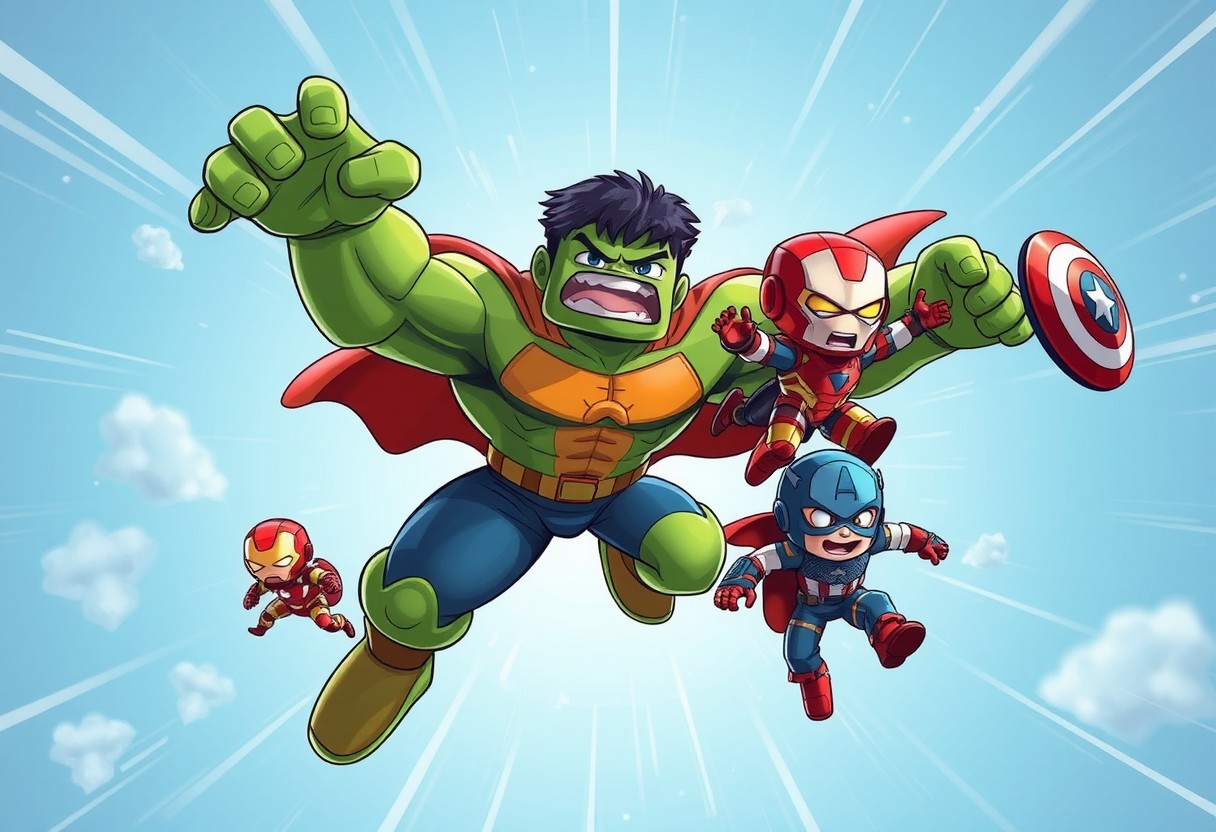 Create a cartoon super hero mini version, like mini people, mini hulk, mini ironman, and mini captain america, dynamic action, the fly from huge bomb expands. colorful and impressive cartoon view.