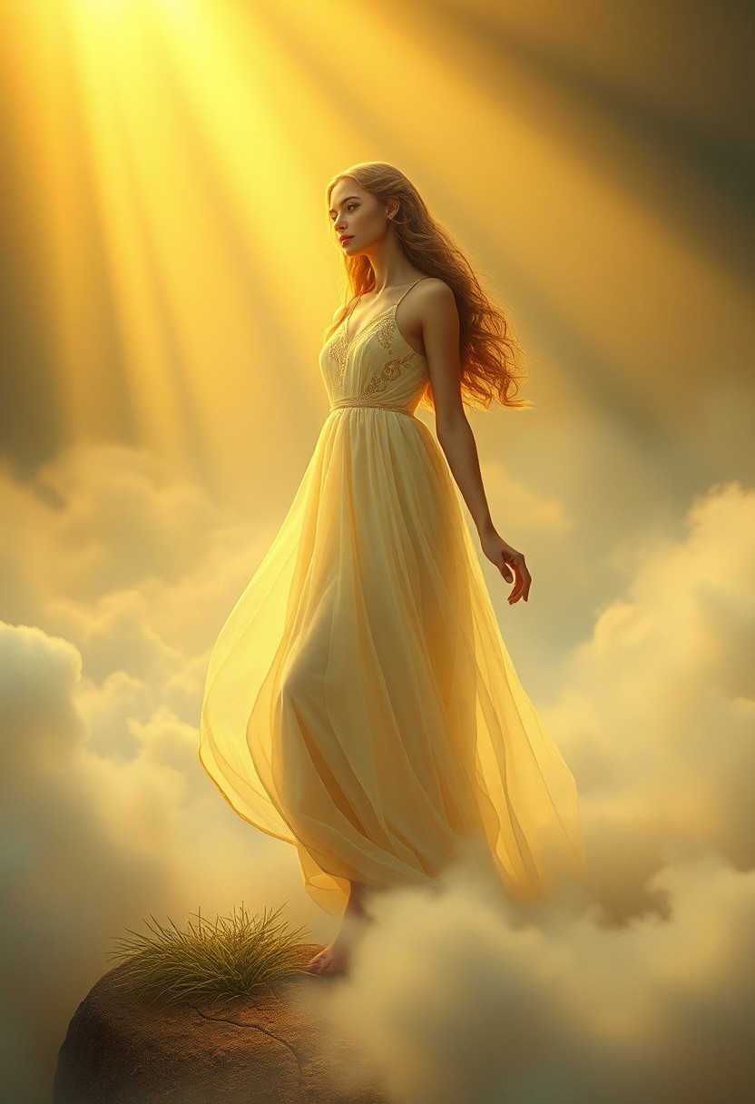 an image so perfect you may wonder if you are dreaming or awake, here she is standing in beatitude covered with an ethereal dress of silk and gold threads, she stands over a heavenly landscape covered in clouds and mist, earth or grass or vapors you do not know for sure what it is. The clouds provide a protective cradle around her delicate figure, basking in the glorious divine golden light descending from the Sun or a deity above the clouds, like a spotlight would on a celebrity, This light is strong and warm but also soft and pleasant like the sun is on a colder day. One glance at her and we all fall in love, taken into romantic reverie yearning for a glance, a word or touch.