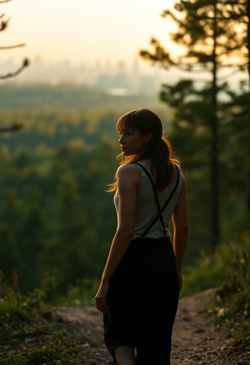 lone roguish female figure, walking away, glancing over shoulder, distant cityscape, transitioning from forest to urban environment, golden light of early morning or late afternoon, cinematic, journey progression, emotional warmth, subtle glance, candid, moment of doubt or hesitation, reflection on the journey, (forest in the background:1.2), city on the horizon, inviting introspection, natural light, dramatic lighting, depth of field, (captured naturally:1.2), (detailed background:1.3), (photorealism:1.4), 8k UHD, (blurry:-1.3), (lowres:-1.5), (ugly:-1.2), (mutated:-1.4), (worst quality:-1.4), (bad anatomy:-1.3), (cartoon:-1.1), (sketch:-1.1), (distorted proportions:-1.3), (extra limbs:-1.5), (cgi:-1.4), (extra characters:-1.5), (savanna:-1.4)