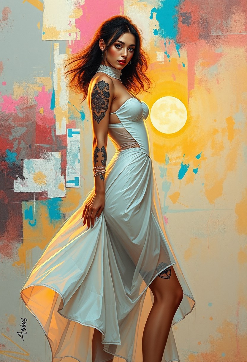 abstract modernist painting, (skirt blown up:1.2), white sexy dress, cyberpunk style, tattooed, , (sheer see-through dress:0.7), perky breasts, best quality,, warm colors, masterpiece, , , at sunset