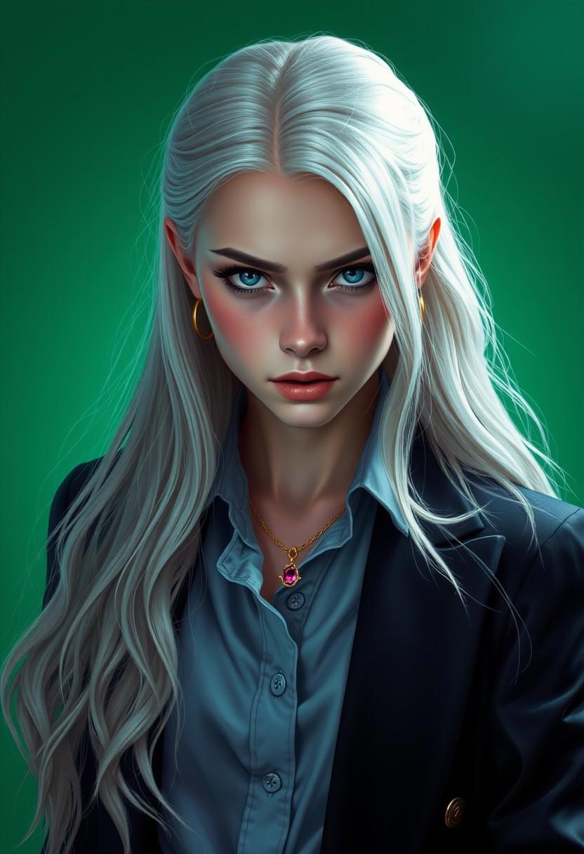 masterpiece, a painting made of precious stones, full body shot, score_9, score_8_up, score_7_up, (best quality:1.1),ultra-detailed, high resolution, super detailed , cinematic, hyperrealistic, Stylized digital portrait of a girl with snow-white skin and long, blonde hair, steel eyes. The subject is wearing a shirt, and a blazer. They have a aggressive expression with slightly parted lips and a aggressive posture. The background is a solid, vibrant emerald, which contrasts with the subject's attire. The person is accessorized with gold jewelry, including a necklace with a ruby pendant and small hoop earrings. full body, easynegative, flat color, dark theme,neon_style, glow, shine