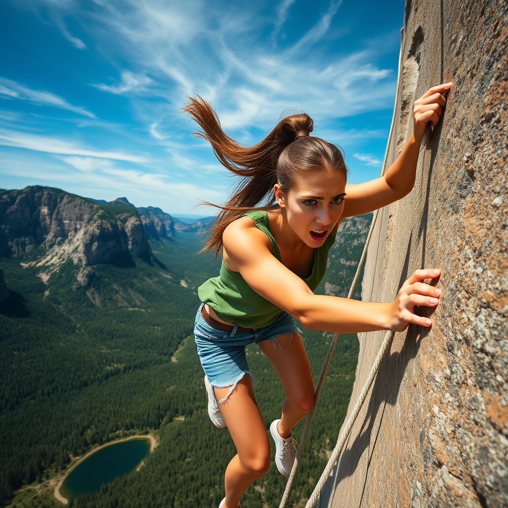 Dramatic action photograph of a woman using a rope to climb a rockface, set against a dramatic landscape of steep cliffs and a dense forest and lake below. She has a panicked expression, with fair skin and long, flowing brown hair tied back in a ponytail. She is dressed in a green sleeveless t-shirt and blue cut off denim shorts and white sneakers. She is spreadeagled against the rockface, her fingers desperately seeking a grip. The background includes a bright blue sky with cirrus clouds. Nikon D6 500mm f/2.8 lens ISO 1600 1/1000 shutter speed