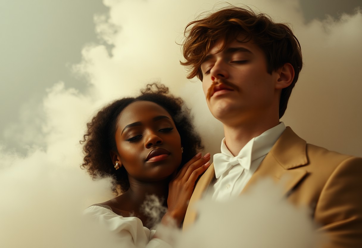 a serene, dark-skinned woman with an Afro, wearing a flowing white gown, gently places her hand on the shoulder of a pale-skinned man with a messy, brown-haired, mustachioed face, donning a 1920s-style suit, his eyes closed in rapture. The woman's face is calm, her dark brown eyes filled with a deep understanding, as the man's expression is one of quiet awe. Soft, feathery clouds envelop the pair, their forms dissolving into the dreamy atmosphere. Cinematography is warm, with a low-contrast, film-grain aesthetic, as if shot on 35mm film with a subtle sepia tone. Softbox lights with a warm color temperature (2700K-3000K) positioned at a 45-degree angle to the characters' faces create a gentle, ethereal glow, while a faint, blue-ish ambient light (5000K-6500K) permeates the scene, evoking a sense of wonder and enchantment, all within a shallow depth of field, blurring the fantastical background.