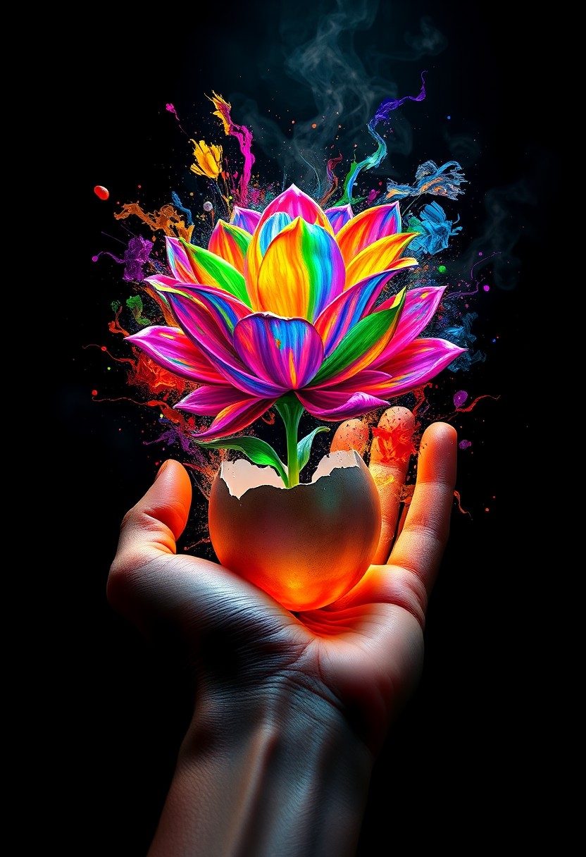 "Create a photorealistic image of the shape of a flower with multicolored petals, outlined with a vibrant, multicolored line, in an acrylic paint that swirls with a kaleidoscope of colors. The flower is sprouting from a cracked egg in the palm of a giant hand. The surrounding environment is pitch black, with only the colorful flower and hand visible. The colors seem to be building up to a catastrophic release, as if the very presence of the flower is triggering a chain reaction of light and energy. The atmosphere is one of intense, impending destruction." Octane render, Highest-Quality, 8 k, intricate details, visually stunning, Masterpiece