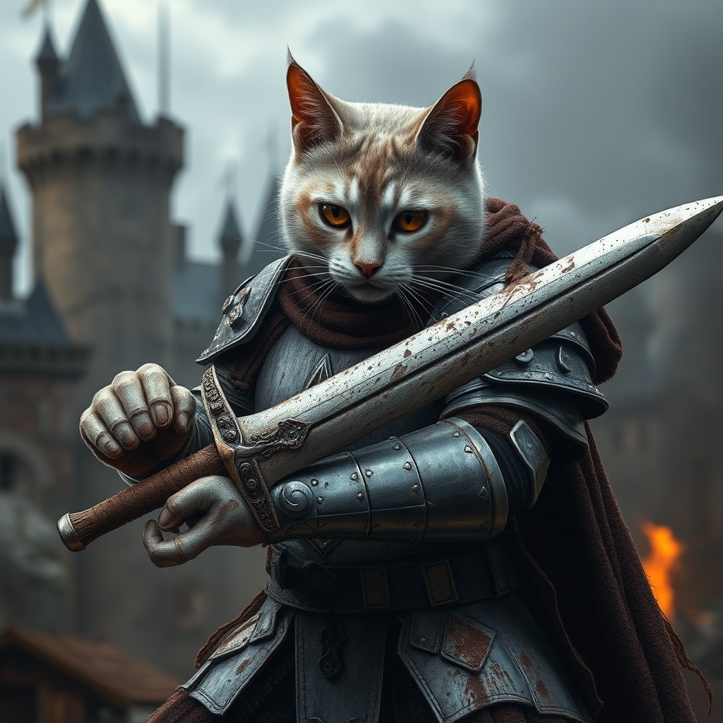 Ultra realistic. white grey brown cat with a damaged knight shite armor holding a long sword, tired, bruises, dusty, mud, shining eyes, protecting a town, background castle, full body view, some fire behind, agressive pose