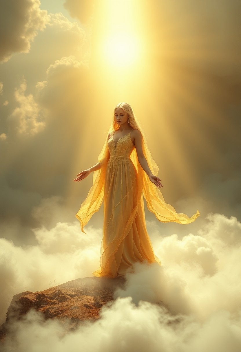 an image so perfect you may wonder if you are dreaming or awake, here she is standing in beatitude covered with an ethereal dress of silk and gold threads, she stands over a heavenly landscape covered in clouds and mist, earth or grass or vapors you do not know for sure what it is. The clouds provide a protective cradle around her delicate figure, basking in the glorious divine golden light descending from the Sun or a deity above the clouds, like a spotlight would on a celebrity, This light is strong and warm but also soft and pleasant like the sun is on a colder day. One glance at her and we all fall in love, taken into romantic reverie yearning for a glance, a word or touch.