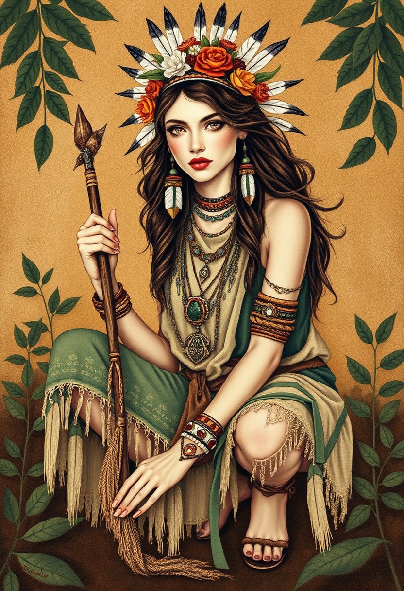 Native American sand painting featuring a woman with a bohemian and tribal aesthetic. She has a slender build, light skin, and long, wavy brown hair adorned with a floral and feather headdress. Her facial features are sharp, with high cheekbones and a focused expression. She is dressed in layered, earth-toned fabrics with various textures, including a mix of greens, browns, and beiges. She wears multiple necklaces, bracelets, and other accessories made of natural materials like beads and feathers. The background is a blend of earthy tones and foliage, giving the image a natural, forest-like setting. The overall composition is dynamic, with the woman in a crouched position, holding a stick, and surrounded by leaves and plants, creating a sense of connection with nature.