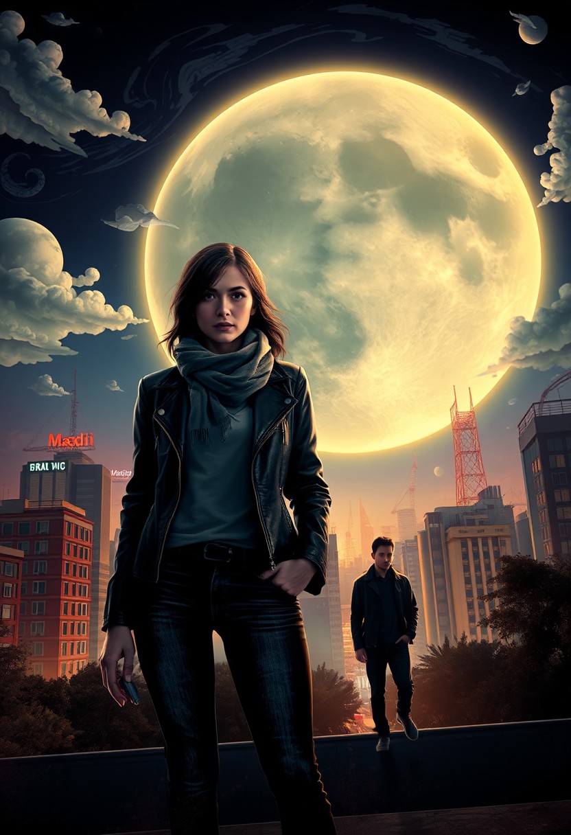 A vibrant, imaginative night scene with a large, glowing full moon over a modern skyline of Madrid. Elena stands in the foreground, casually dressed in a sleek leather jacket and dark jeans. A loose scarf around her neck hints at her undercover role. The moonlight bathes her in a soft, ethereal glow, giving her an otherworldly aura while maintaining a modern, urban look. Sergio lurks further back, blending into the city shadows. He wears a dark jacket and jeans, with only part of his figure illuminated by the moonlight, leaving most of his face obscured, adding to his mysterious and dangerous presence. His connection to the city night feels almost surreal, like an extension of the urban landscape. The background features a fantastical version of Madrid’s skyline, with iconic landmarks like Gran Vía and Torres Kio subtly visible. The sky swirls with whimsical clouds and abstract shapes, blending the city's lights with the fantastical elements of the night. The glowing moon reflects off the buildings, merging reality with a dreamlike atmosphere. The result is a blend of modernity, fantasy, and emotional depth, with the surreal moonlight emphasizing the tension and attraction between the characters in a modern urban setting.