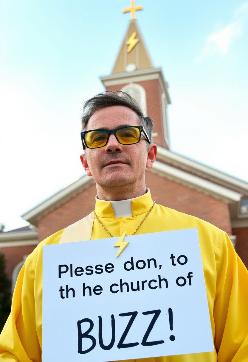 Man wearing yellow tinted glasses and a yellow priest uniform in front of church like building which has a gold lightning bolt symbol on its spire roof, he is wearing golden lightning bolt symbol necklace prominently visible, he is holding sign with text "Please donate to the church of BUZZ!". No cross symbol.