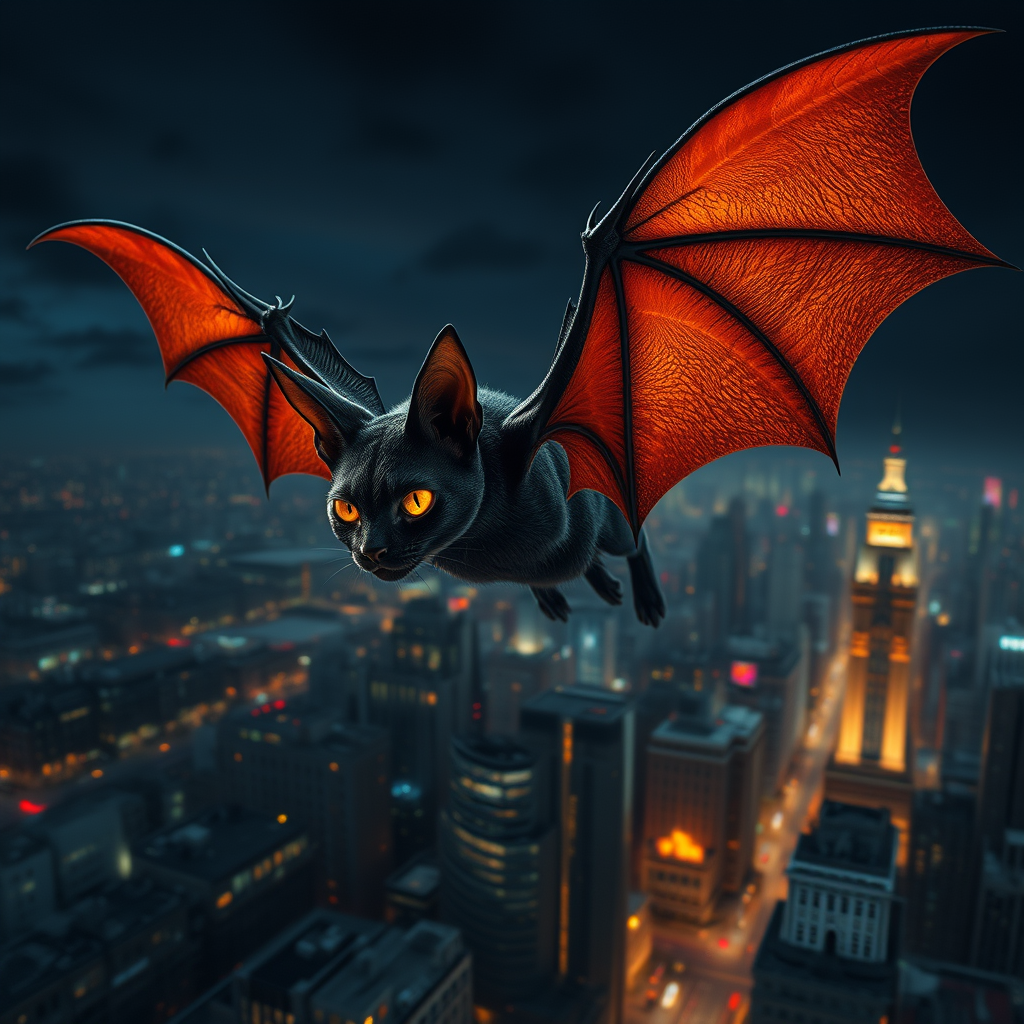 hyperrealistic art a bat-cat hybrid with leathery wings and glowing eyes, flying through the night sky above a sprawling cityscape, with neon lights reflecting off its fur as it hunts in the darkness. extremely high-resolution details, photographic, realism pushed to extreme, fine texture, incredibly lifelike