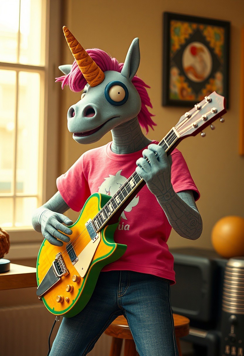 a weird Peruvian dvd that is a mix of cel animation, claymation, early CGI, and live-action, a creepy CGI man in a pink unicorn t-shirt holds a guitar in one hand, and a Croissant in the other,