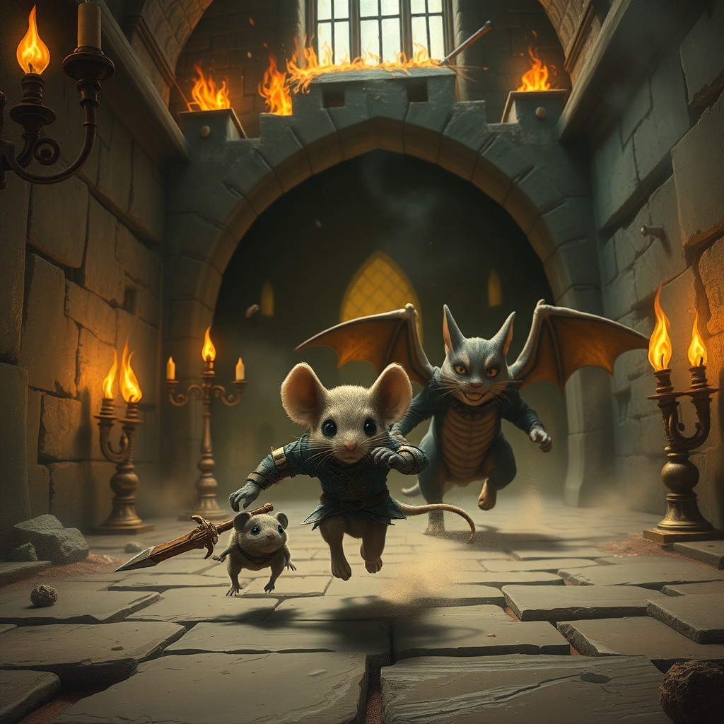 Inside castle, burning torches on walls, metal bars, candelabra, little mouse whit a little rusty armor and a small sword runing escaping, behind a furious big cat in a dragon suit chasing the mouse, dust from his paws, parts of the castle falling from the roof, trembling