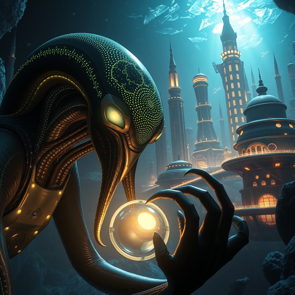 "(Ultra-realistic, 32k, Masterpiece, High Quality, Detailed Realistic Background, Official Art, Realistic Lighting). Create a close-up scene of an Abyssal Navigator, a deep-sea alien species adapted to survive in the crushing depths of a distant ocean world. Their sleek, elongated bodies are marked with glowing bioluminescent patterns, like intricate constellations on dark, smooth skin. The creature’s glowing eyes and patterned facial features are sharply focused as it uses tentacle-like appendages to hold an advanced underwater navigation tool. In the background, depict their sci-fi architecture—structures made of pressure-resistant alloys, glowing with bioluminescent accents. These resemble organic, flowing forms, with towering metallic spires, floating platforms, and translucent surfaces that reveal machinery beneath. Energy conduits pulse with light, connecting parts of the city. This blend of natural shapes and advanced technology reflects a balance between their alien ocean environment and high-tech civilization. Epic dark lighting fills the scene, with soft rays filtering through the icy surface above, casting an ethereal glow over the architecture and creatures."