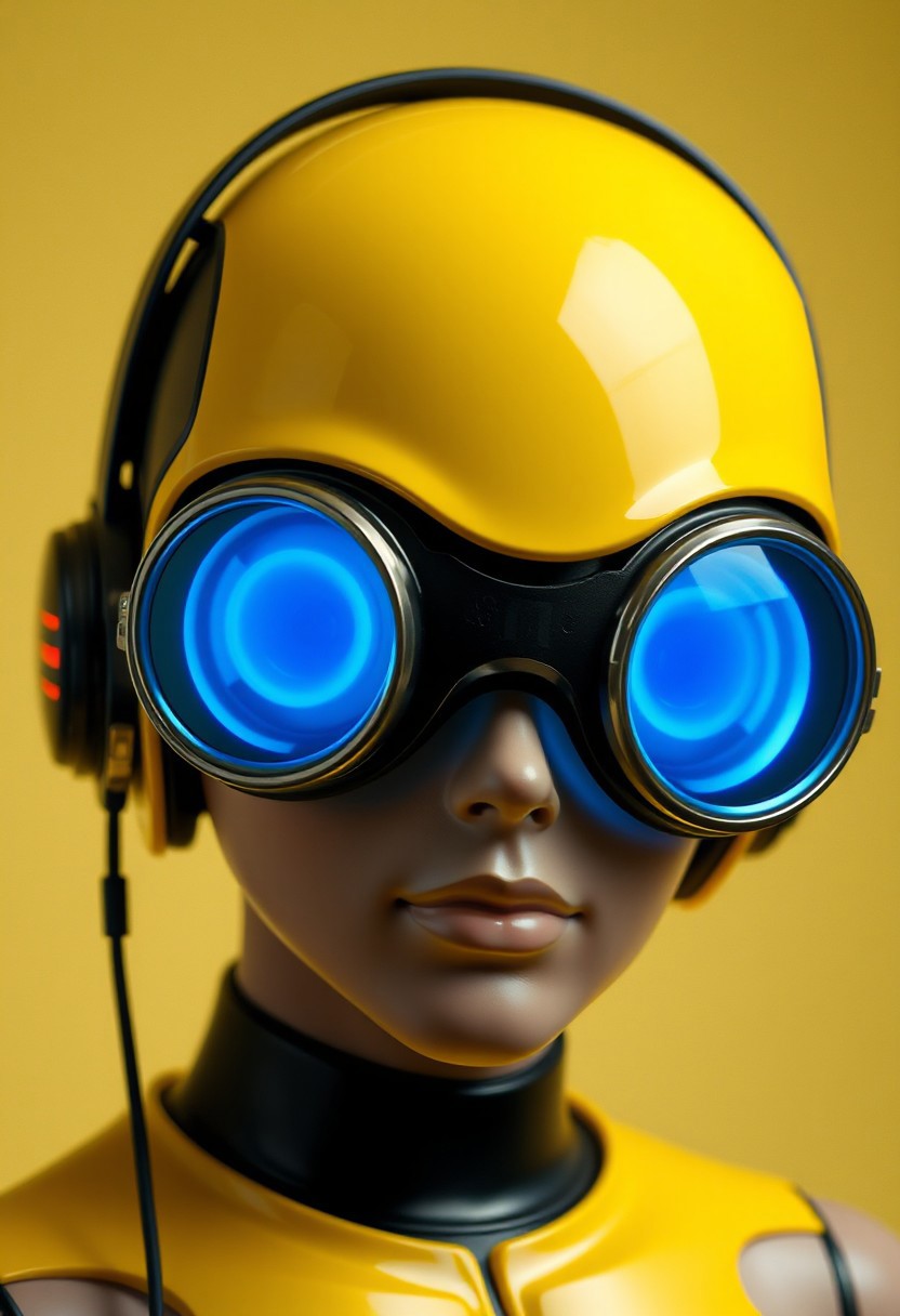 The figure's head is encased in a streamlined helmet, predominantly yellow with black accents. The helmet appears highly polished, with a smooth, almost glossy finish. Integrated into the helmet are large, circular, reflective lenses that cover the eyes entirely. The lenses glow with blue hue, giving off a cool, futuristic aura. These oversized goggles suggest an augmented reality or heads-up display function, typical of high-tech environments. Around the figure’s ears are sleek, futuristic headphones, which are seamlessly built into the helmet design. These headphones are primarily black with red, horizontal stripes along the side, indicating an interface for communication or audio enhancements. The skin tone appears smooth and artificial, hinting at synthetic or modified human characteristics