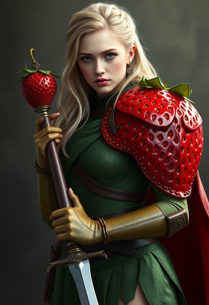 A fair maiden ready to protect the fruit realm. Her pale skin and blonde hair contrast with the bright red of her strawberry plate armor. The enchanted maroon berry's skin and achene protect the heroine against blows, cuts and fire. She wears a green weaved tunic under the armor. She clinches her leaf armor firmly holding a sword in her other hand.