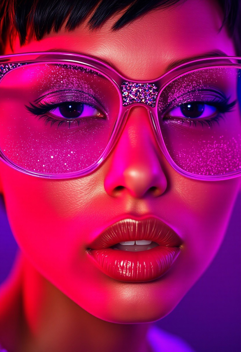 Neon-lit close-up, A hyper-realistic close-up of a beauty supermodel sexy honey brown woman face, big lips, stylish pixie cut bathed in neon pink and purple light with glittering particles on her skin, neon sunglasses with glitter textures patterns, fashion magazine style, beautiful background, Use soft colors and a shallow depth of field
