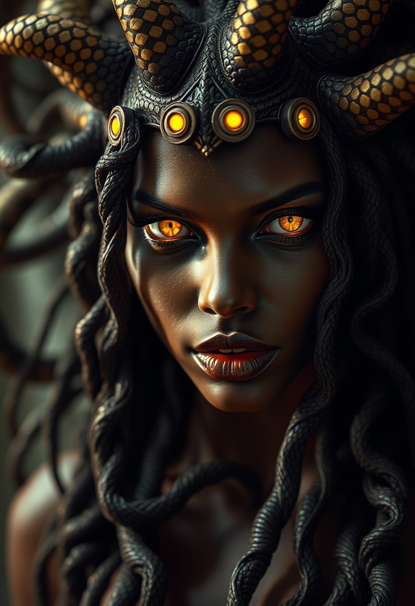 Modern, 2020s, detailed cinematic shot from, realistic cinematic scene, dark brown woman portrays Medusa, the gorgon woman with writhing snake hair, full lips glowing yellow eyes, no pupils, Intricate, Sharp focus, Highly detailed, Fantasy, Trending on Artstation, Digital painting, Dark lighting, ominous mood., realistic Medusa high saturation, Bright, Vibrant, full of action, Very stylish, full body shot of showing detailed intricate work, shot in the style of wes anderson and stephen king, oscar winning photography, striking image captures, meticulous attention, stunning costume design