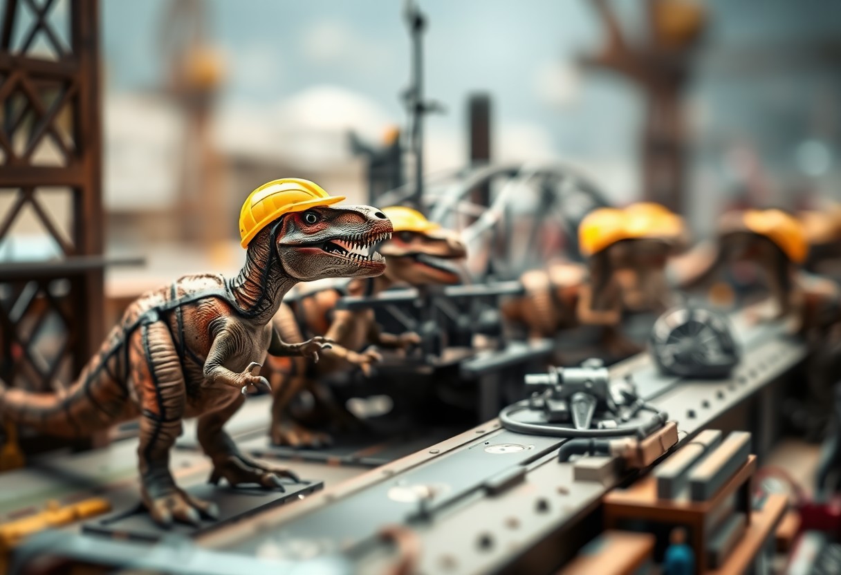 A masterpiece tilt-shift scene, photogenic soft lighting, an extremely detailed diorama photograph with vivid natural colors, showing a bunch of T-rexes dinosaurs building a metal ship at a shipyard Each T-rex is wearing a yellow construction helmet, and they are using their stubby little dinosaur arms to operate the heavy machinery required to build the ship, the ship is still in the early stages of construction consisting of nothing but a structure made from curved metal beams that form the skeleton of the ship, bokeh, depth of field. 4K digital photo quality, bokeh, vivid rich colors, depth of field, extremely detailed background, maximalist, life-like masterpiece realistic photo, hyper-realism, photogenic soft atmosphere, dynamic scene, absurdres, 8k photography, three point perspective, Ultra-realistic, extreme amount of details thay mimic richness of real life