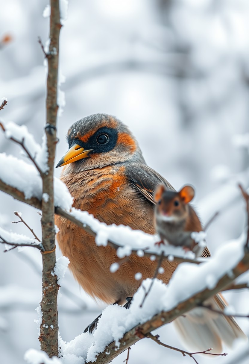 Robin the bird with tipical mask on the face in snowy tree, Batman like a mouse watch him